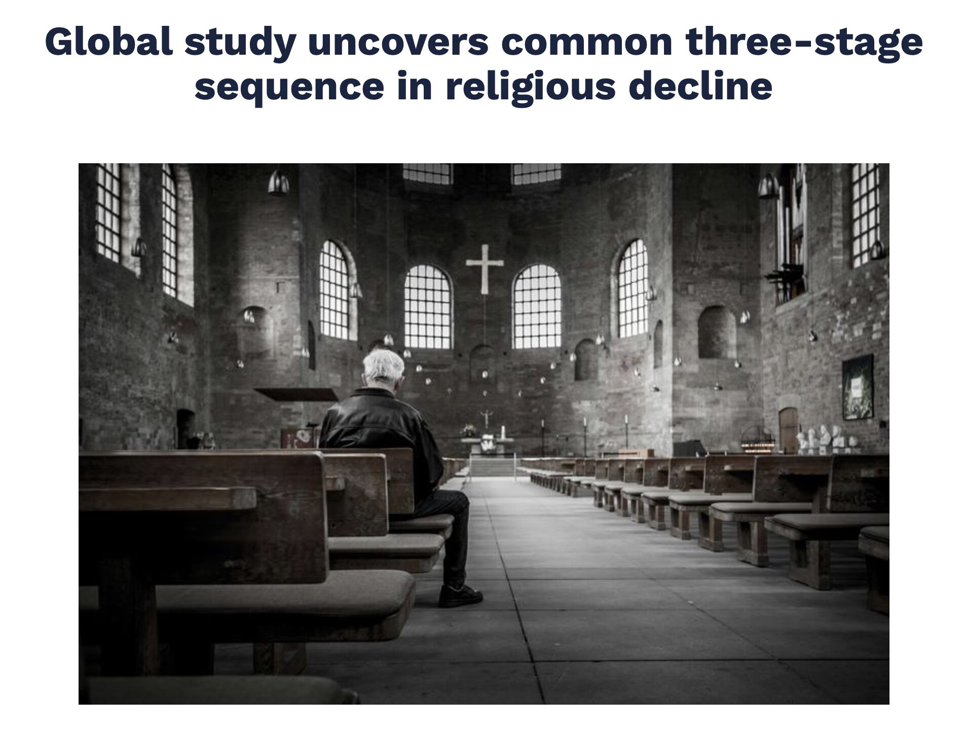 지난 8월 19일, 스위스 로잔 대학과 영국 옥스퍼드 대학, 그리고 미국 메릴랜드 대학의 연구자들이 여러 여론조사 기관에서 실시한 자료를 분석해 111개국의 종교성 변화를 연구했다. 그 결과, 서구 유럽에서 주로 관찰되던 세속화의 흐름이 종교와 상관없이 전 세계적으로 확산되고 있다는 주목할 만한 보고를 내놓았다. 연구진은 세속화가 다음의 세 단계로 진행된다고 설명한다.[1]